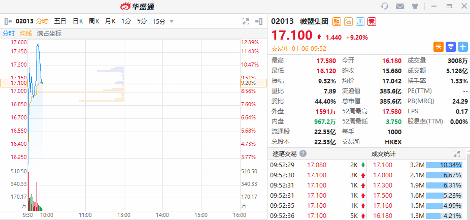 华盛资讯1月6日讯,微盟集团盘中股价再创新高,截至发稿,上涨9.2%,现报17.1港元,成交3008万股,涉资5.126亿元,总市值385.6亿港元。