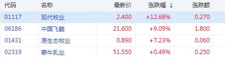 华盛资讯1月6日讯,港股乳制品板块微涨,其中,成分股现代牧业涨超12.68%,中国飞鹤涨9.09%,原生态牧业涨超7.23%。蒙牛乳业涨0.49%。