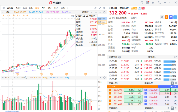 1月6日消息,美团涨5.26%,现报312.2港元,股价重返一个月来高点,最新市值18369亿港元。