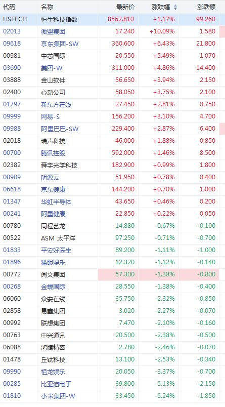 京东集团涨超6%,中芯国际涨超5%,美团涨超4%。网易涨超3%,阿里巴巴涨超2%。
