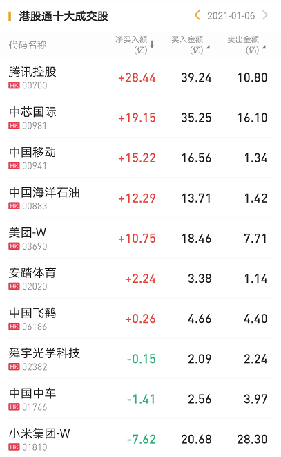 个股方面,今日南下资金继续净买入腾讯控股28.44亿港元,为今日买入之最。此外,南下资金净买入中芯国际19.15亿港元,净买入中国移动15.22亿港元。