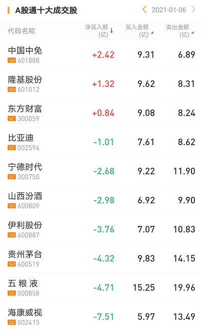 北上资金今日净买入中国中免2.42亿元,为今日买入之最。此外,北上资金今日净买入隆基股份1.32亿元。