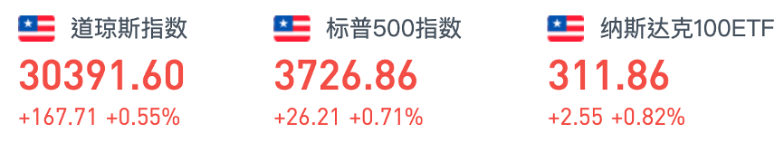美股周二市况反覆,三大指数轻微低开后,道指一度温和下跌82点,盘中暂低见30141点;其后重拾上升动力,尾段最多抽高268点,高见30504点。截至收盘,道指涨167.71点,涨幅0.55%,报30391.60点;标普500涨27.17点,涨幅0.73%,报3727.82点;纳指涨120.51点,涨幅0.95%,报12818.96点。