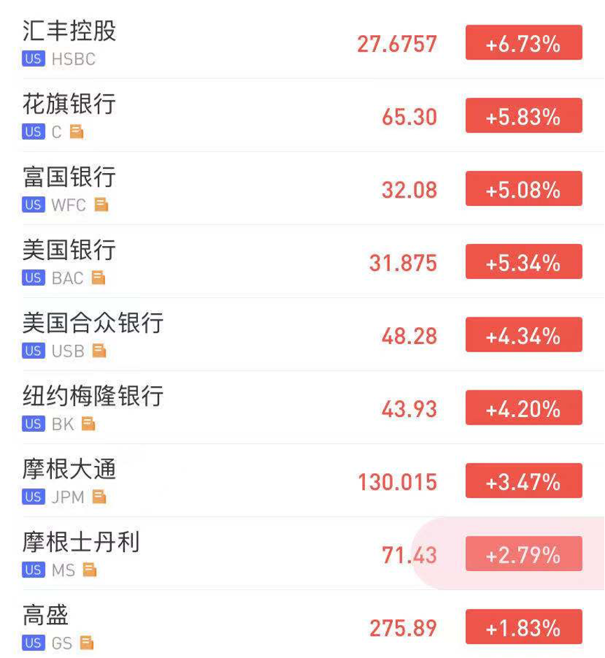 截至发稿,汇丰控股大涨6.73%,花旗银行涨5.83%,富国银行涨5.08%,美国银行涨5.34%。此外,美国合众银行、纽约梅隆银行均涨超4%;摩根大通涨超3%,摩根士丹利涨超2%。