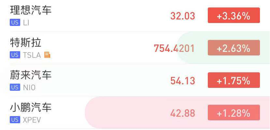 截至发稿,理想汽车大涨3.36%,特斯拉涨2.63%,蔚来、小鹏均涨超1%。