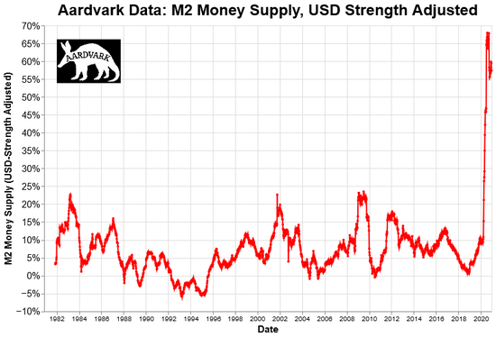 下面来看看从1980年至今,经过美元汇率调整过后的M2供应量。