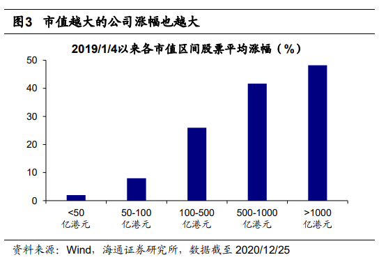 对全部港股按市值进行分组,市值越大的公司涨幅也越大,2019/1/4-2020/12/25 期间市值在 50 亿港元以下的公司平均涨幅为 2.0%,50-100 亿港元的公司为 8.0%,100-500 亿港元的公司为 26.0%,500-1000亿港元的公司为 41.7%,1000 亿港元以上的公司为 48.2%,表明港股存在明显的龙头效应。