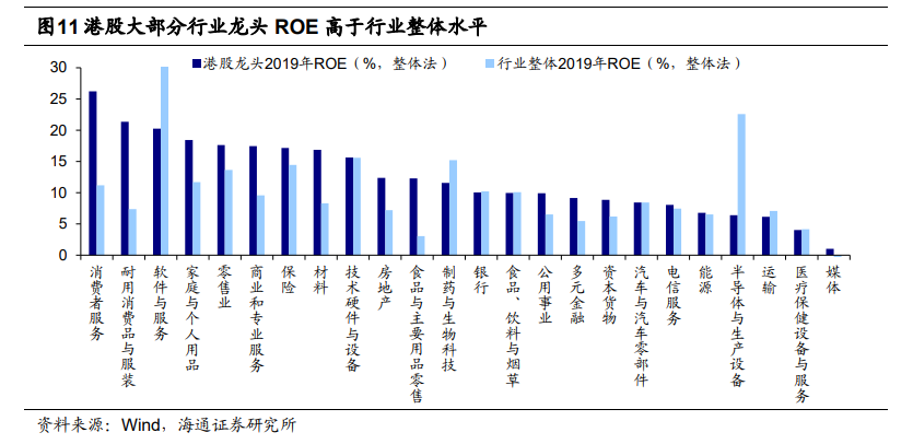 随着行业集中度提升和产业升级推进,龙头公司业绩表现更优异,新经济的优势尤为明显。对比各行业市值最大的前三家公司和行业整体ROE,大多数行业的龙头公司盈利能力优于行业平均,其中消费板块表现最为突出,例如消费者服务龙头/行业 2019 年 ROE(整体法)为 26.2%/11.2%,耐用消费品与服装为 21.4% /7.4%。