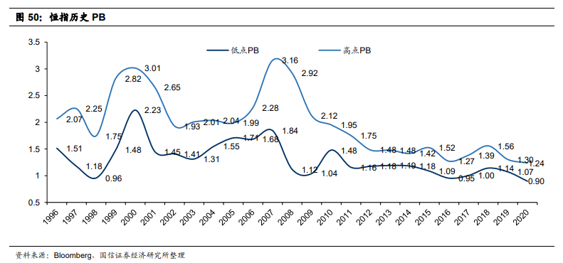 2020 年,恒生指数的估值创了历史新低(0.90),而大级别低点分别为 1998 年的 0.96 倍(亚洲金融危机),2003 年的 1.31 倍(科网泡沫+SARS),2008 年的 1.04 倍(金融危机),2016年的 0.95 倍(大宗商品周期底部+联系汇率担忧)。