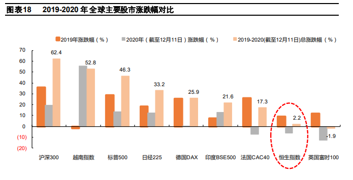 2020 年,全球资本市场在不平凡中走过。2019-2020 年股市大多经历了大幅上涨,但有两个市场成为了例外。一个是英国股市;另外一个,就是香港股市。与其他主要股指动辄 20%-70%的涨幅相比,恒生指数在 2019-2020 年(截至 12 月 11 日)的总涨跌幅仅为2.2%。