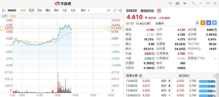 华盛资讯1月7日消息,次新股新纽科技(09600)盘中异动,股价升逾12%,自上市首日破发后,创新高。截至发稿,新纽科技涨12.44%,现报4.61港元每股,当前成交额2.984亿港元,总市值36.88亿港元。较发行价4.12港元已涨超12%。