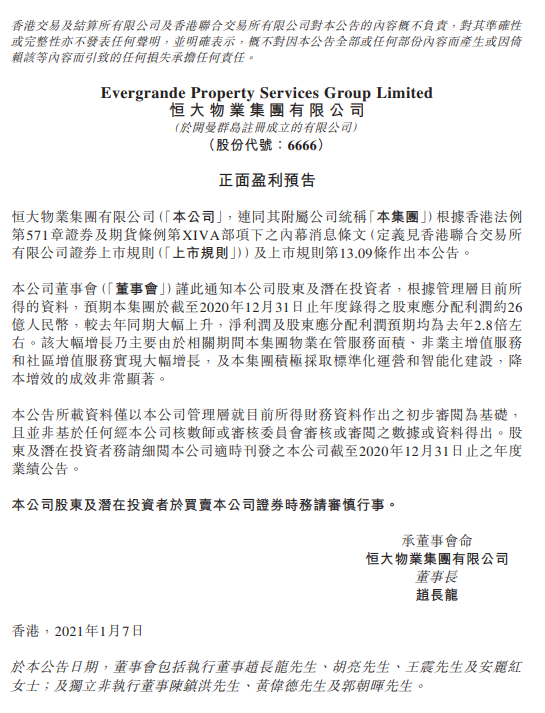 1月7日消息,恒大物业(06666.HK):预期本集团于截至2020年12月31日止年度录得之股东应分配利润约26亿元人民币,较去年同期大幅上升。该大幅增长乃主要由于相关期间本集团物业在管服务面积、非业主增值服务和社区增值服务实现大幅增长,及本集团积极采取标准化运营和智能化建设,降本增效的成效非常显着。