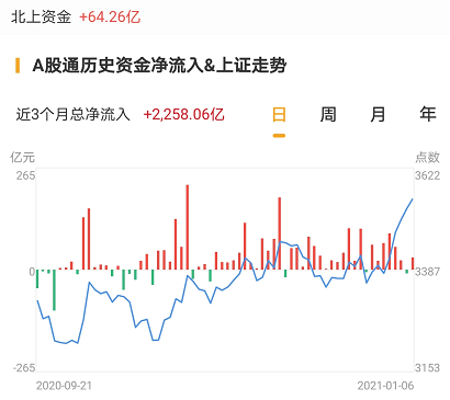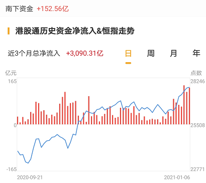 南下资金今日净流入港股152.56亿港元,2021年前4个交易日,南下资金已经净流入逾520亿港元,表现相当凶猛。
