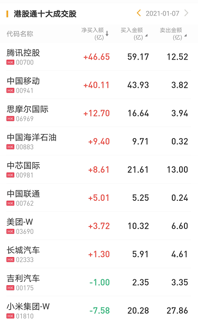 个股方面,今日南下资金继续净买入腾讯控股46.65亿港元,为今日买入之最。此外,南下资金净买入中国移动40.11亿港元,净买入思摩尔12.7亿港元。