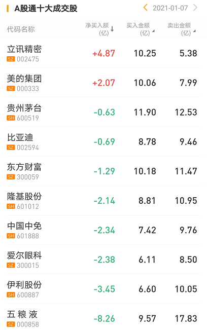 北上资金今日净买入立讯精密4.87亿元,为今日买入之最。此外,北上资金今日净买入美的集团2.07亿元。