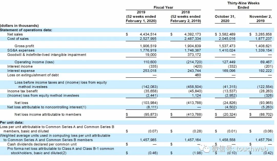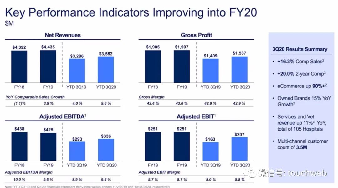招股书显示,Petco在2018财年、2019财年营收分别为43.92亿美元、44.35亿美元;Petco在截至2020年10月31日的39周的营收为35.82亿美元,上年同期的营收为32.86亿美元。