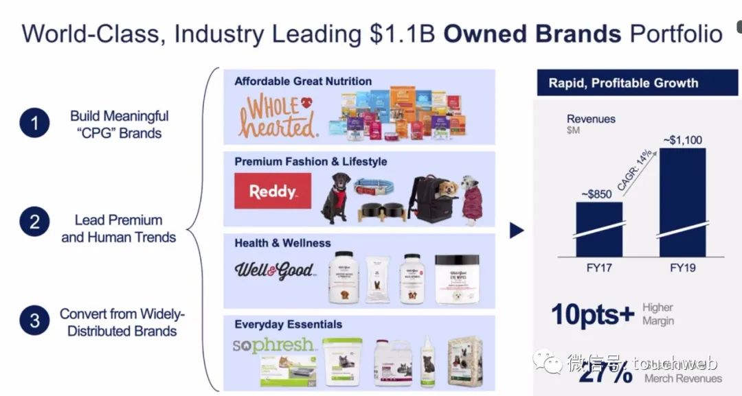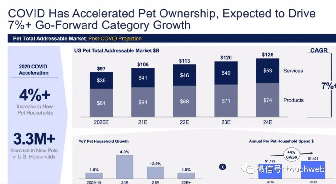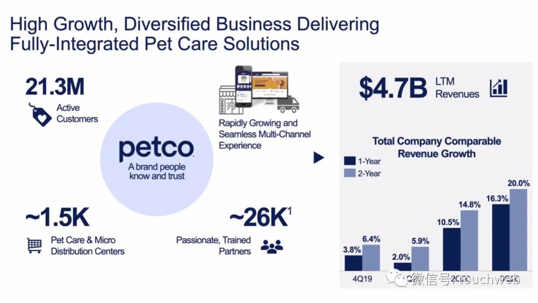 2017年4月,美国宠物用品零售商PetSmart宣布收购了Chewy,当时传闻的价格是33.5亿美元。Chewy是2019年在美国上市,上市以来表现良好,当前市值高达387.97亿美元。