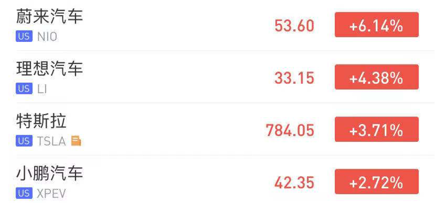 截至发稿,蔚来汽车大涨6.14%,理想汽车涨4.38%,特斯拉大涨3.71%再创历史新高,小鹏汽车涨2.72%。