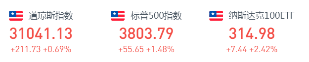截至收盘,道琼斯指数涨211.73点,涨幅0.69%,报31041.13点;标普500指数涨55.64点,涨幅1.48%,报3803.78点;纳斯达克综合指数涨326.69点,涨幅2.56%,报13067.48点。