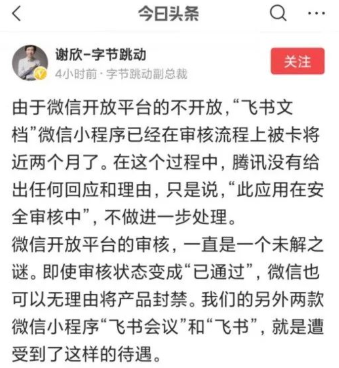 1月7日,字节跳动副总裁谢欣在微头条发文称,微信开放平台无理由封禁和限制了多款飞书小程序,包括“飞书”、“飞书会议”和“飞书文档”等。谢欣表示,腾讯对飞书的无理由全面封杀,已经对很多用户的日常工作造成了困扰,希望腾讯能够从公平、公正的立场出发,“停止无理由的封杀”。