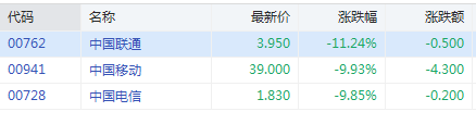 港股电信股开盘集体下挫。中国电信跌10%,中国联通跌11%,中国移动跌10%。此前纽交所宣布推进对中国三大电信运营商摘牌,三大运营商称将保护合法权益。