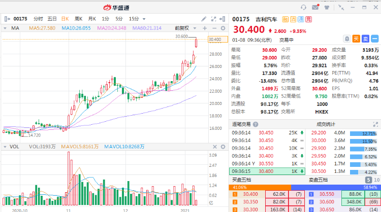 1月8日消息,吉利汽车拟2021年实现153万辆的销量目标,公司股价大幅走高,截至发稿,吉利汽车涨9%,报价30.4港元,市值冲刺3000亿港元。