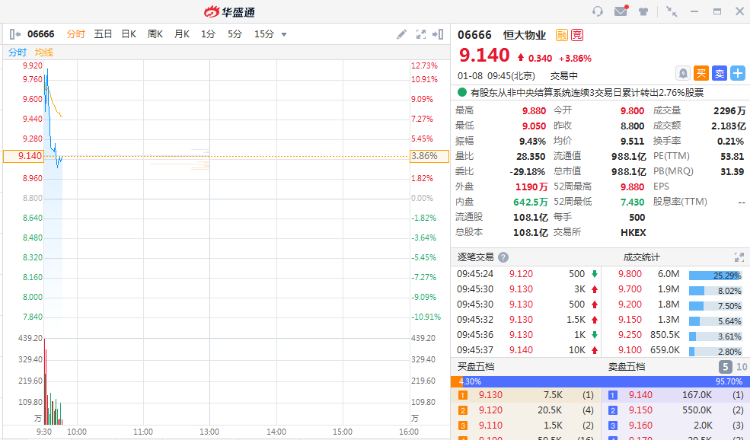 1月8日消息,恒大物业一度涨超12%,此后迅速跳水涨幅收窄至3%,恒大物业(06666)昨日(1月7日)盘后发盈喜,预期2020年取得股东应分配利润约26 亿人民币,较去年同期大幅上升,净利润及股东应分配利润预期均为去年2.8倍左右。