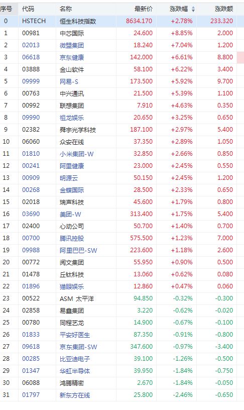 中芯国际大涨8%,领涨指数成分股。SaaS股大涨,微盟集团涨7%、金山软件大涨超6%。
