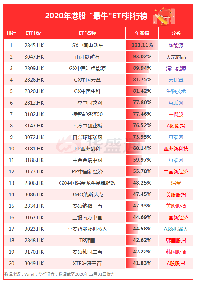而在刚刚落幕的跌宕起伏的2020年,又冒出了哪些一鸣惊人的资产呢?让我们通过港美两地ETF的年度表现来一探究竟。