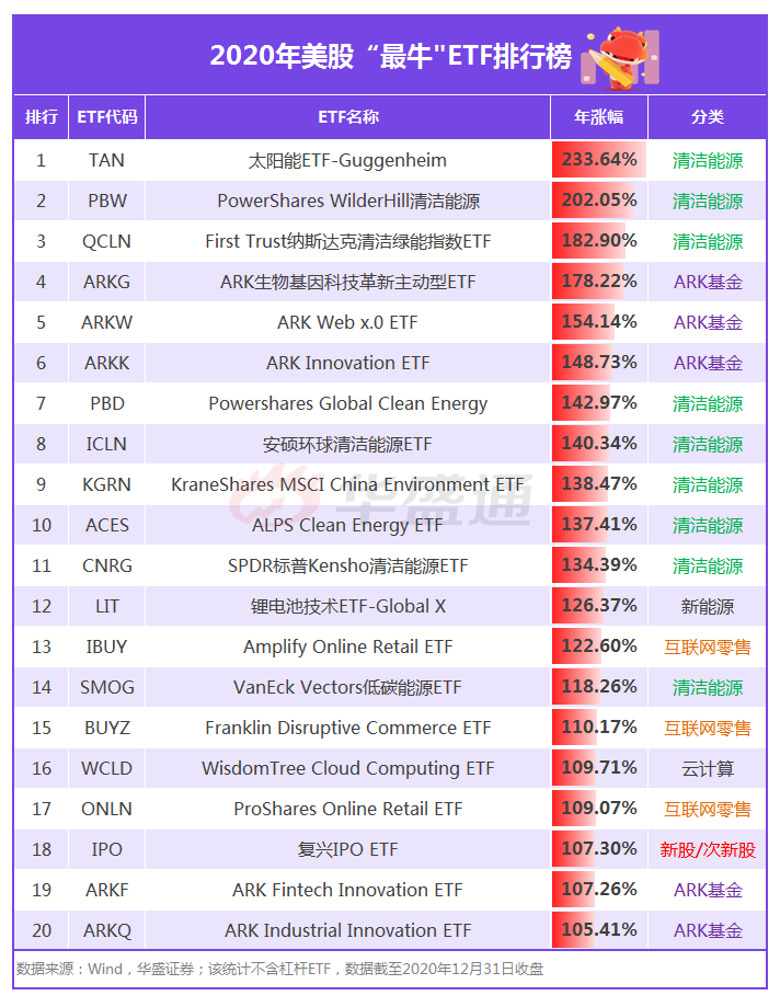 当然,2020也是美股IPO的大年, IPO融资规模创历史新高,首日平均收益也创出互联网泡沫以来的最高水平,专门“炒新”的IPO ETF全年回报率超107%,赫然上榜。