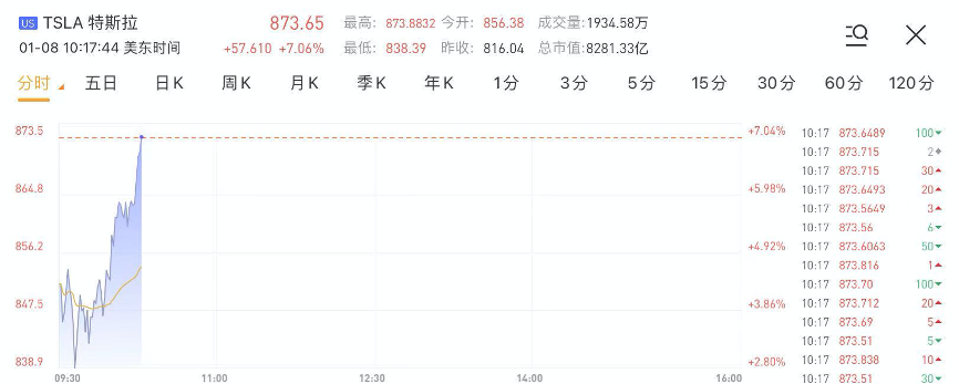 华盛资讯1月8日讯,特斯拉涨幅扩大至7%。截至发稿,特斯拉涨7.06%,现报873.65美元,当前总市值8281亿美元,成交量超过1900万。2021年,特斯拉累计涨幅超过23%。