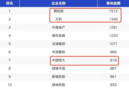中指院统计显示,2020年全年,碧桂园、万科分别以1512亿元、1349亿元的拿地金额分列第1、2位,恒大则以918亿元拿地金额位居第9。