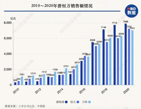 2020年,碧万恒一起撞线7000亿销售关口,碧桂园以7888亿元全口径销售额卫冕。随后,恒大、万科相继公布了2020年销售业绩,恒大仍然压过万科,以7233亿元的合约销售额位列第二,第三名万科的合同销售金额为7041.5亿元。
