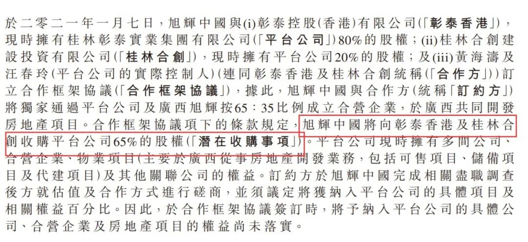 后面看到,旭辉官网集团新闻措辞是:根据协议,旭辉集团与彰泰集团将按照65%:35%的股权比例共同合作成立平台公司。