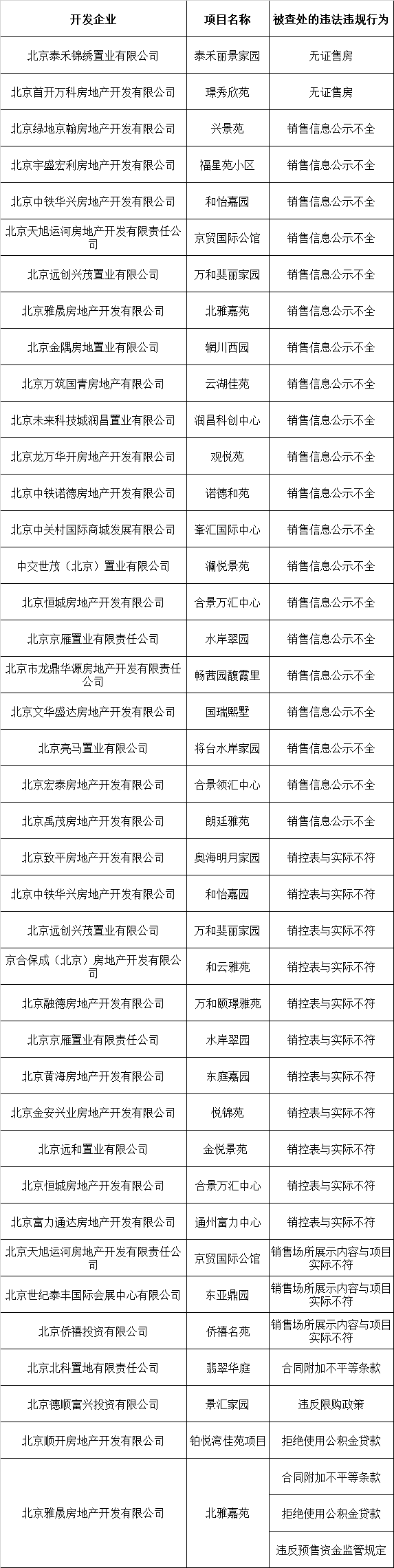 对北京顺开房地产开发有限公司铂悦湾佳苑项目拒绝购房人使用公积金贷款,雅居乐(03383.HK)拥有的北京雅晟房地产开发有限公司北雅嘉苑项目不执行预售资金监管制度,旭辉集团(00884.HK)控制的北京德顺富兴投资有限公司景汇家园项目不执行限购政策等18家存在违规问题的开发企业下达责令改正通知书,并采取限制网签、约谈告诫、信用监管等多种手段进行惩戒。