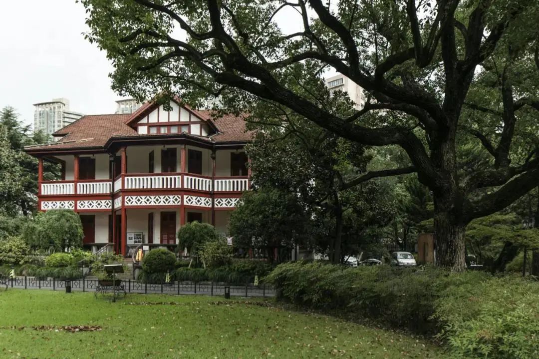 花园之东的1号楼为主楼,是上海第一幢西式花园住宅。这是一幢面向宽阔草坪的英国乡村式假三层小楼,红的木柱与白的栏杆错落有致,使洋楼掩映在郁郁葱葱的花木之中。