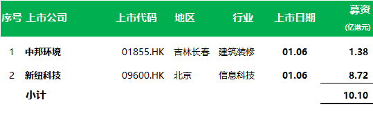 跨入新的一年,2021年第一周,香港交易所迎来2家新上市公司,共募资10.10亿港元。
