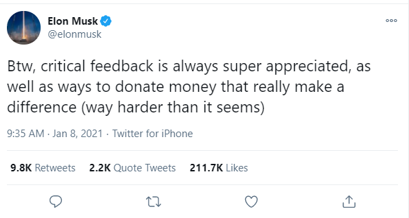 尽管马斯克也签署了《捐赠誓言》,但他在公开场合的慈善行为相对较少。据Quartz网站分析,马斯克向马斯克基金会捐赠了2.57亿美元,相当于他目前净资产的0.001%。2016年至2018年,马斯克基金会向约200家非营利组织捐赠了6500万美元。