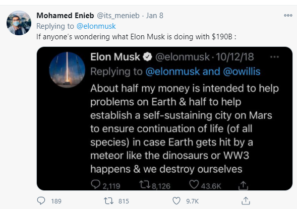 如今,王多鱼有了现实版,受益于特斯拉股价飙涨而荣登世界首富宝座的马斯克,也有了“钱太多,怎么花”的烦恼。