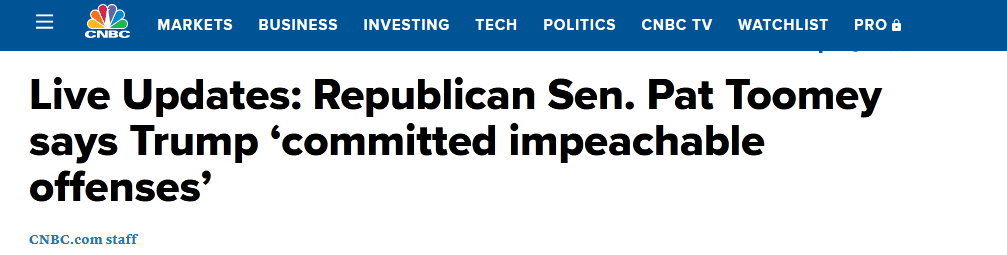 【环球网快讯】美国消费者新闻与商业频道(CNBC)刚刚消息,美国共和党参议员帕特•图米当地时间9日在接受福克斯新闻采访时表示,特朗普“犯下了可被弹劾的罪行”,而这将使他失去(总统)任职资格。