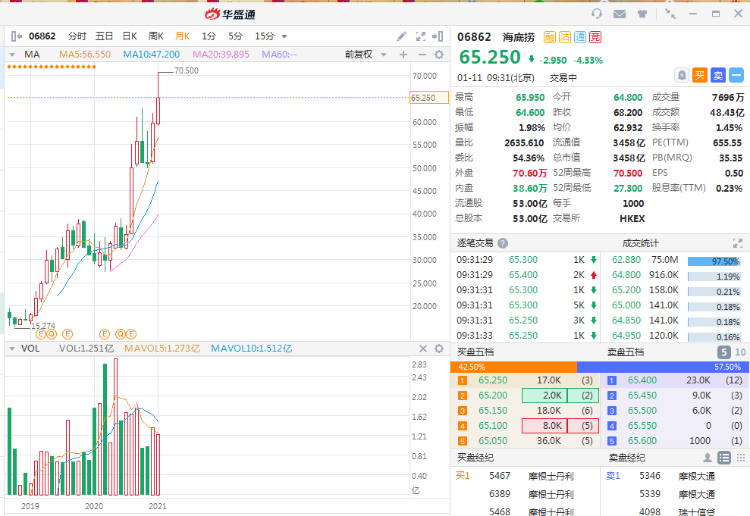1月11日消息,海底捞跌4.33%,报65.25港元,市值3458亿港港元,股东拟售股套现逾46.6亿。