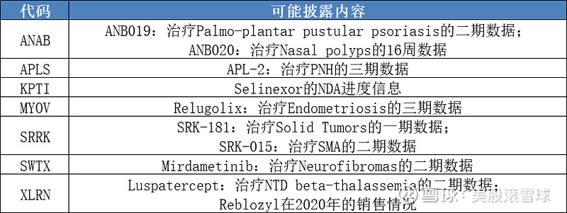 公司此前是CNS领域的龙头企业,在今年上半年有多个重磅数据公布:SAGE-324治疗Essential tremor的二期数据、SAGE-718治疗Parkinson的二期数据以及SAGE-217治疗MDD的三期数据,SAGE很有可能在此次大会上披露相关信息,如果数据不错,公司市值很可能重回百亿美元。