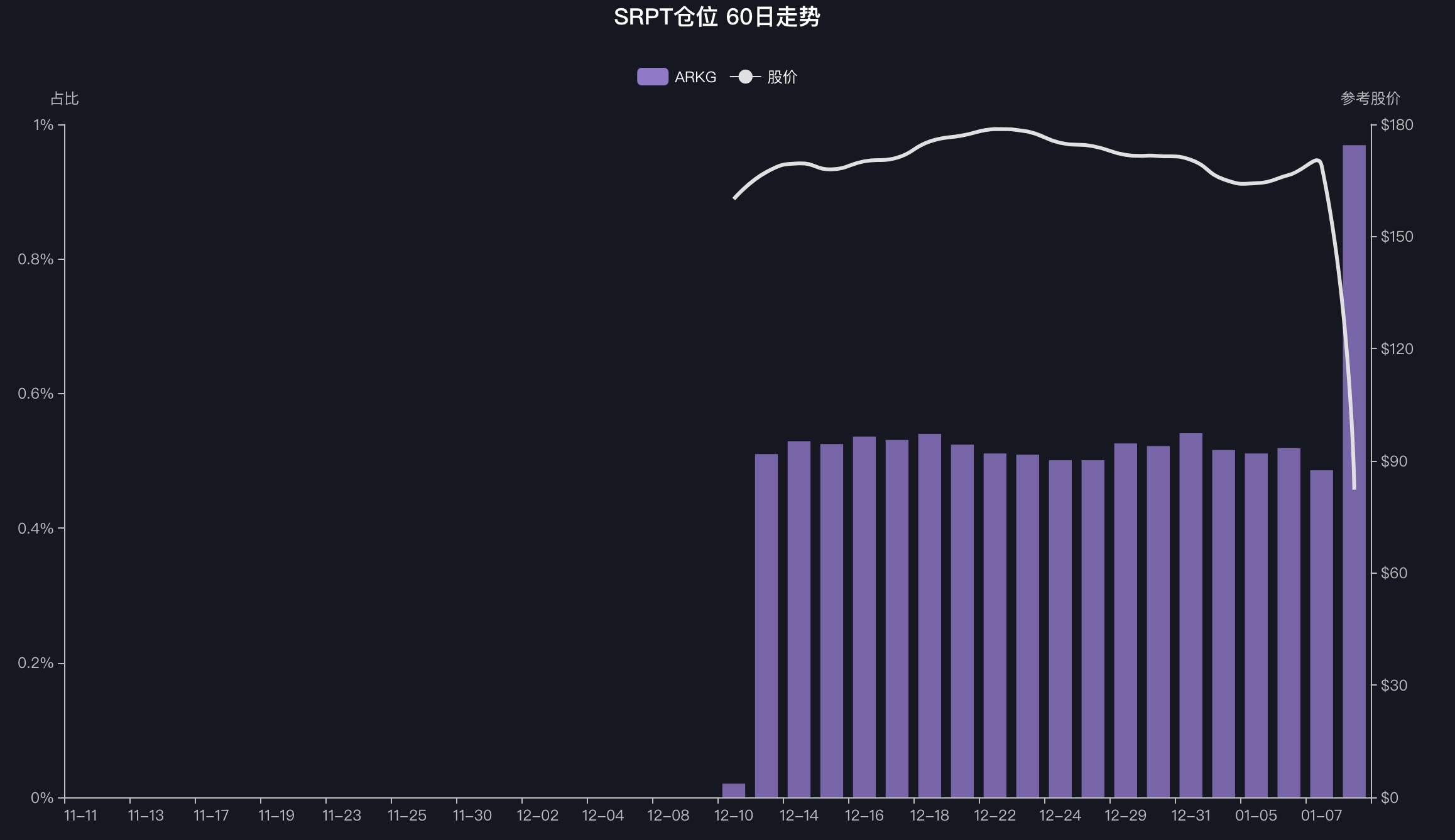 其中,近60天ARK所持有Sarepta治疗的仓位变化明显增加,ARK在暴跌当日奋勇出手: