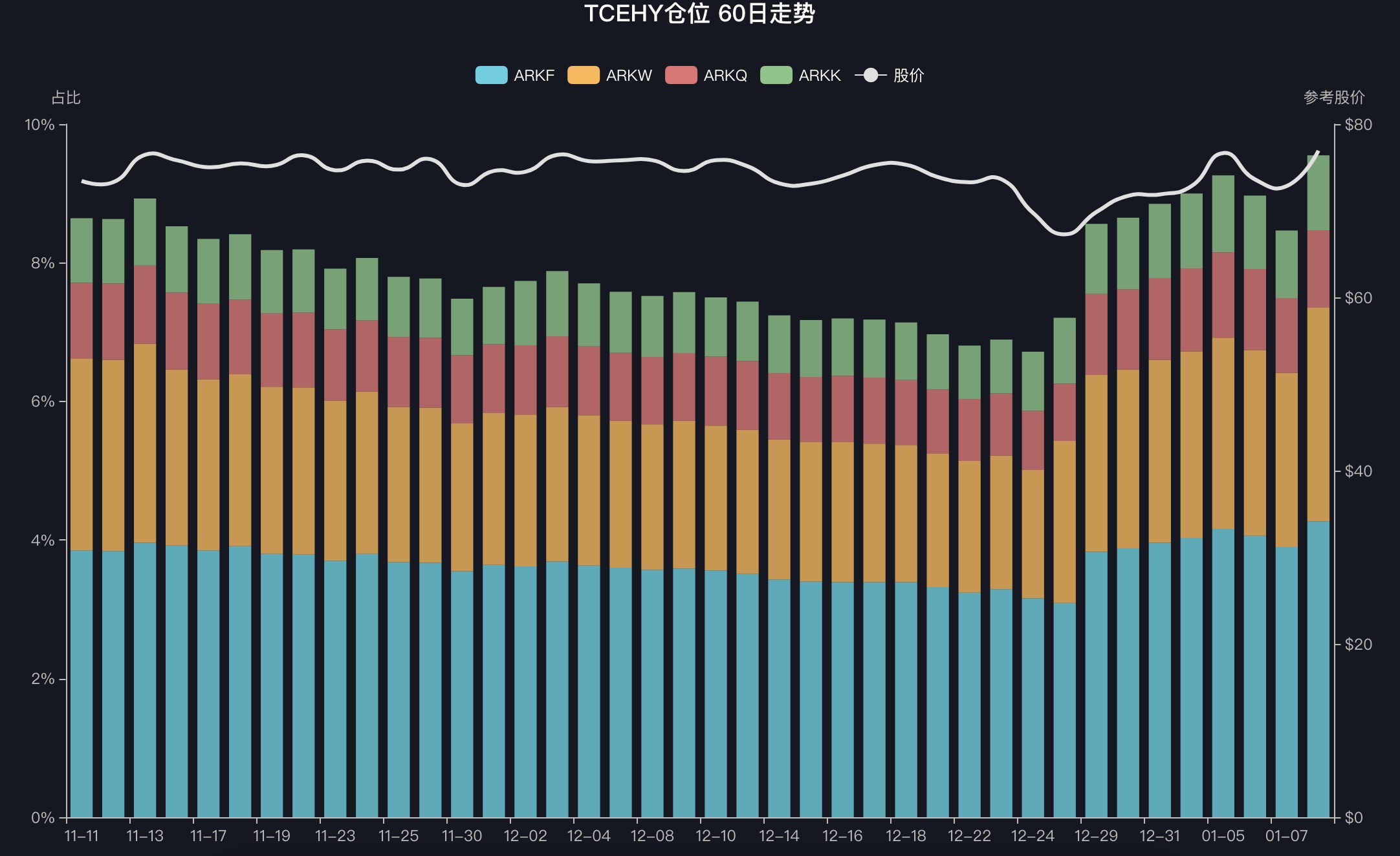 近60天ARK所持有的腾讯控股ADR仓位变化如下,可见有明显增长: