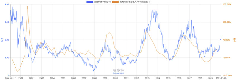在《Micron美光科技:半导体的周期股》中说过,美光科技的单季度收入同比和PB存在正相关关系。