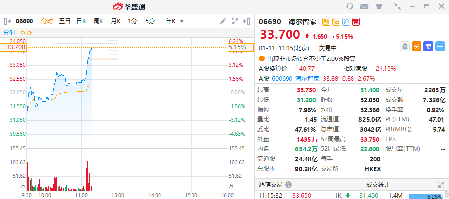 华盛资讯1月11日消息,次新股海尔智家(06690)盘中短线拉升逾5%,最高见33.75港元,创历史新高。截至发稿,海尔智家涨至5.15%,现报33.7港元每股,成交额达7.326亿,当前总市值为3042亿港元。