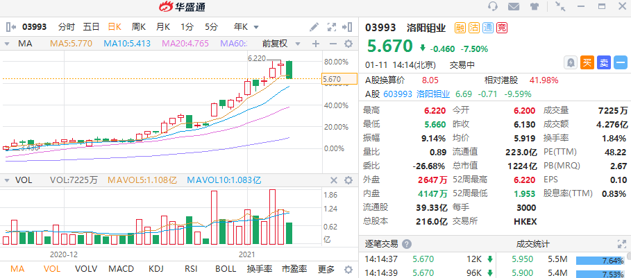 华盛资讯1月11日消息,洛阳钼业H股今日大跌超7%,A股亦近跌停。截至发稿,洛阳钼业跌7.5%,现报5.67港元每股,当前成交额4.276亿港元,当前总市值为1224亿港元