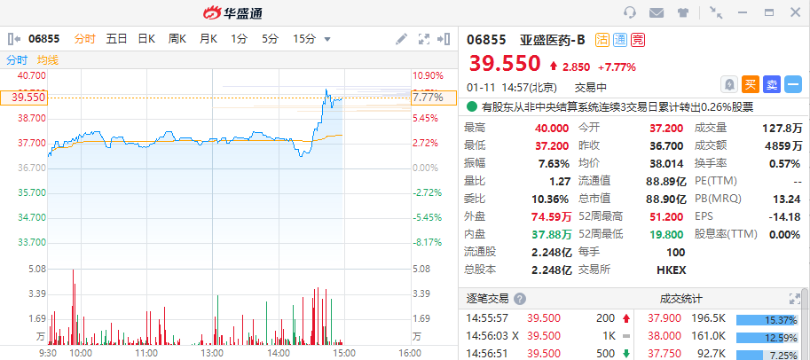 华盛资讯1月11日讯,亚盛医药-B(06855)盘中异动,短线拉升逾7%。截至发稿,亚盛医药涨7.77%,现报39.55港元每股,当前成交额4859万港元,总市值为88.9亿港元。