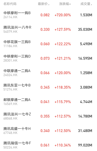 中移摩利一一购B(26114)涨720%占据涨幅榜第一,其次是腾讯法兴一八牛R(54079)涨127.59%,中移花旗一三购B(11186)涨122.22%。