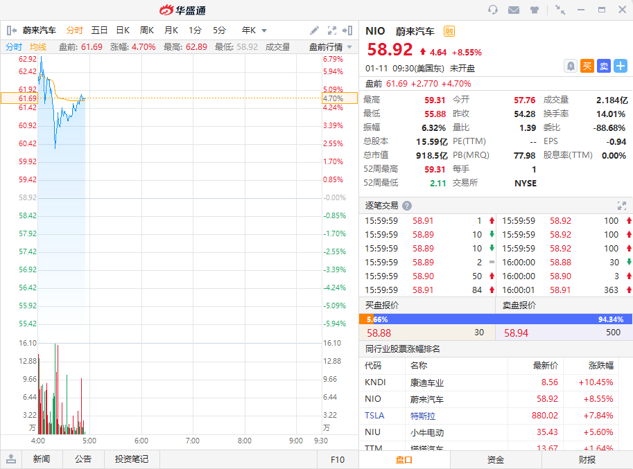 华盛资讯1月11日讯,蔚来汽车(NIO)盘前涨4.7%, 摩根大通:将蔚来汽车(NIO.N)目标价从50美元升至75美元。